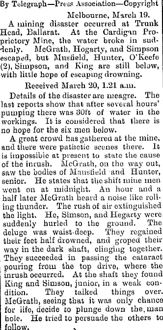 By Telegraph—Press Association—Copyright Melbourne, March 19. A mining disaster occurred at Trunk Head, Ballarat. At the Cardigan Proprietory Mine, the water broke in suddenly. McGrath, Hogarty, and Simpson escaped, but Musfield, Hunter, O’Keefe (2), Simpson, and King are still below, with little hope of escaping drowning. Received March 20, 1.21 a.in. Details of the disaster are meagre. The last reports show that after several hours’ pumping there was 30ft of water in the workings. It is considered that there is no hope for the six men below. A great crowd has gathered at the mine, and there were pathetic scenes there. It is impossible at present to state the cause of the inrush. McGrath, on the way out, saw the bodies of Mansfield and Hunter, senior. He states that the shift mine men went on at midnight. An hour and a half later McGrath heard a noise like rolling thunder. The rush of air extinguished the light. He, Simson, and Hegarty were suddenly hurled to the ground. The deluge was waist-deep. They regained their feet half drowned, and groped their way in the dark shaft, clinging together. They succeeded in passing the cataract pouring from the top drive, where the inrush occurred. At the shaft they found King and Simson, junior, in a weak condition. They talked things over. McGrath, seeing that it was only chance for life, decide to plunge down the. man bole. He tried to porsuade the others to follow.