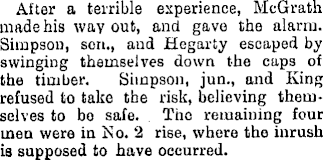 After a terrible experience, McGrath made his way out, and gave the alarm. Simpson, sen., and Hegarty escaped by swinging themselves down the caps of the timber. Simpson, jun., and King refused to take the risk, believing themselves to bo safe. The remaining four men were in No. 2 rise, whore the inrush is supposed to have occurred.