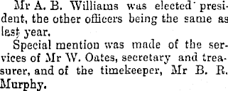 Mr A. B. Williams was elected' president, the other officers being the same as last year. Special mention was made of the services of Mr W. Oates, secretary and treasurer, and of the timekeeper, Mr B. R. Murphy.