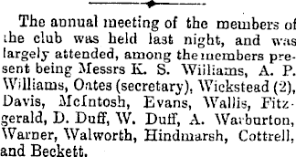 The annual meeting of the members of ihe club was held last night, and was largely attended, among the members present being Messrs K. S. Williams, A. P. Williams, Oates (secretary). Wickstead (2), Davis, Mclntosh, Evans, Wallis, Fitzgerald, D. Duff, \V. Duff, A. Wai burton, Warner, Walworth, Hindmarsh, Cottrell, and Beckett,