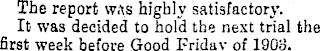 The report was highly satisfactory. It was decided to hold the next trial the first week before Good Fridav of 1903.