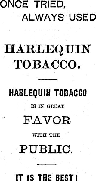 ONCE TRIED, ALWAYS USED HARLEQUIN TOBACCO. HARLEQUIN TOBACCO IS IN GREAT FAVOR WITH THE PUBLIC. IT IS THE BESTI