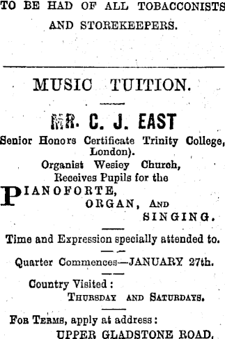 TO BE HAD OP ALL TOBACCONISTS AND STOREKEEPERS. MUSIC TUITION. m. C. J. EAST Senior Honors Certificate Trinity College, London). Organist Wesiey Church, Receives Pupils for the PIANOFORTE, ORGAN, And SINGING. Time and Expression specially attended to. Quarter Commences—JANUAßY 27th. Country Visited: Thuksday and Satdbdayb. Fob Tebms, apply at address: UPPER GLADSTONE ROAD.