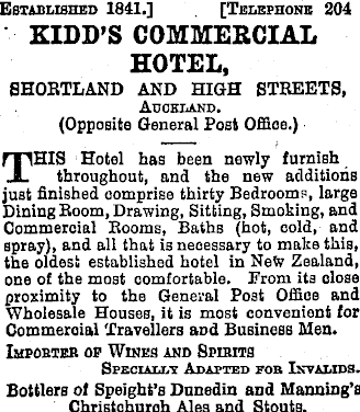 Established 1841.] [Telephone 204 KIDD’S COMMERCIAL HOTEL, SHORTLAND AND HIGH STREETS, Auckland. (Opposite General Post Office.) THIS Hotel has been newly furnish throughout, and the new additions just finished oomprise thirty Bedrooms, large Dining Room, Drawing, Sitting, Smoking, and Commercial Rooms, Bathß (hot, cold, and spray), and all that is necessary to make this, the oldest established hotel in Netv Zealand, one o£ the most oomfortable. Prom its close proximity to the General Post Office and Wholesale Houses, it is most convenient for Commercial Travellers aDd Business Men. Importer op Wines and Spirits Specially Adapted pob Invalids. Bottlers of Speight's Dunedin and Manning’s Christohnrch Ales and Stouts.