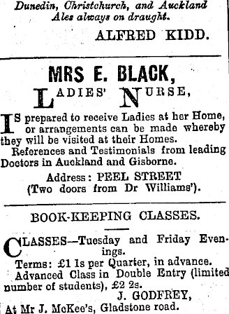 Dunedin , Christchurch, and Auckland Ales always on draught . ALFBED KIDD. MRS E. BLACK, Jj AD IB S’ IST U R S E, IS prepared to receive Ladies at her Home, or arrangements can be made whereby they will be visited at their Homes. References and Testimonials from leading Dootors in Auckland and Gisborne. Address: PEEL STREET (Two doors from Dr Williams'). BOOK-KEEPING CLASSES. CLASSES— Tuesday and Friday Evenings. Terms: £1 Is per Quarter, in advance. Advanced Class in Double Entry (limited number of students), £2 2s. J. GODFREY, At Mr J. McKee’s, Gladstone road.