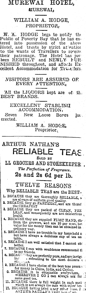 MUREWAI HOTEL, fIfUREWAIj WILLIAM A. HODGE, PROPRIETOR.W. A. HODGE begs to notify the Public of Poverty Bay that be has en tered into possession of the above Hotel, and trusts by strict at entioi to the wants of Travellers to receive their patronage. The Hotel has jus been REBUILT and NEWLY lUK NISHED throughout, and affords Es cellent Accommodation for Tri. tilers [VISITORS ARE ASSURED OF EVERY ATTENTION,, All the LIQUORS kept are of th BEST BRANDS. EXCELLENT STABLING ACCOMMODATION, Seven New Loose Boyes jus erected. WILLIAM A. HODC-rE. Proprietor. ARTHUR NATHAN’S RELIABLE TEAS SOU) BY LL GEOOEES AND STOEEEEEPEE The Perf action of Fragrance. 2s and 2s 6d per lb. TWELVE REASONS Why RELIABLE TEAS are the BEST1. BECAUSE they ire thoroughly RELIABLE, i _ _ _jWeal ways of uniform good quality S ' Bt ihe P C S iS 0 / AaTg£ST ’ 3re thSlei 3. BECAUSE they are packed of CLEAN, I’ftE aad cousequentl y are not deleterious 4. BECAUSE they are supplied FIItST HAND dii from the growers, and are 20 per ordinary m ° ney than be obtained in 5. BECAUSE I have no trouble in my household e ; table* 76 ahVay3 a deUcioa3 cup of tea on 6 ‘ BEC b^«^? l ““ WeU 1 cannot ob‘ 7 ' BE w'S?fri e < Sd d . With ooa4dm “«»nI tl 8. BECAC - - ■ +.ey are perfectly pure, and are inviec “f ‘ r ™ es ti n g to the most deUoate t 9. EECAUSE I have choice o£ the best teas proca : in China, India, and Ceylon. BE \VHEM'Vyp'? ° bt “ nab!e everywhere, WHEivEa IGO I can always sak for same good tea. 11, BECAUSE there is full weight in each pack 41 ways the case with other brs 12, nEO.-AUtE having tried u.*r.y other I ANTKU& NATHAN’S TBAS i-j>i >■' nii-