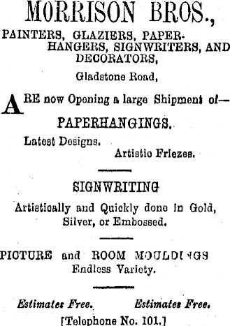 MORRISON BROS., PAINTERS, GLAZIERS, PAPER. HANGERS, SIGNWRITERS, AND DECORATORS, Gladstone Road, now Oponing a large Shipment of— PAPERHANGINGS. Latest Designs. Artistio Friezes, SIGNWRITING Artistioally and Quickly dono in Gold, Silver, or Embossed. PICTURE and ROOM MOULD! <tGS Endless Variety. Estimatet Free. Estimates Free. [Telephone No. 101.]