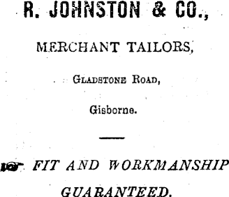 R. JOHNSTON & GO., MERCHANT TAILORS, Gladstone Eoad, Gisborne. iar FIT AND WORKMANSHIP GUARANTEED.