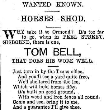 WANTED KNOWN. HORSES SHOD. WHY take it to Ormond ? It's too far to go, when in PEEL STREET, GISBORNE, there is one, TOM BELL, THAT DOES HIS WORK WELL. Just turn in by the Times office, And you’ll see a yard quite free, Well sheltered from the lee, Which will hold horses fifty. It’s built on good ground, With wood and iron fenoe all round. Come and see, bring it to me, And a guarantee I’ll give thee.