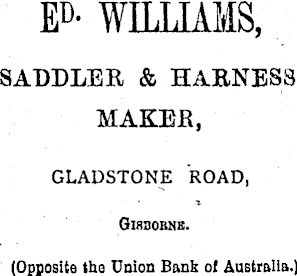 E D - WILLIAMS, SADDLER & HARNESS MAKER, GLADSTONE ROAD, Gisbobne. (Opposite the Union Bank of Australia.)
