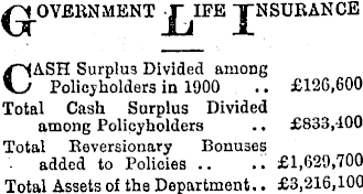 £jI.OVEKNIIENT JNSURANCE CASH Surplus Divided among Policyholders in 1900 .. £120,600 Total Cash Surplus Divided among Policyholders .. £833,400 Total Eeversionary Bonuses added to Policies .. .. £1,629,700 Total Assets of the Department.. £3,216,100