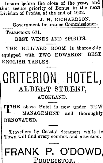 Insure before the close of the year, and thus secure priority of Bqnu3 in the next Division of Profits, at the end of 1902. J. H. RICHARDSON, Government Insurance Commissioner. Telephone 671. BEST WINES AND SPIRITS. THE BILLIARD ROOM is thoroughly equipped with TWO EDWARDS’ BEST I ENGLISH TABLES. CRITERION HOTEL, ALBERT STREET, AUCKLAND. rriHE above Hotel is now under NEW J- MANAGEMENT and thoroughly RENOVATED. Travellers by Coastal Steamers while in Town will find every comfort and attention. FRANK P. O’DOWD, Proprietor.