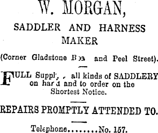 W. MORGAN, SADDLER AND HARNESS MAKER (Corner Gladstone Bja and Peel Street). FULL Suppl, , all kinds of SADDLERY on har d and to order on the Shortest Notice. REPAIRS PROMPTLY ATTENDED TO. Telephone, No. 157.