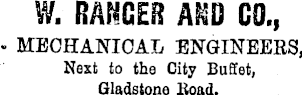 W. RANGER AND CO., MECHANICAL ENGINEERS, Next to the City Buffet, Gladstone Road.