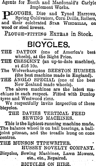Agents for Booth and Macdonald's Carlyle Implement Works. PLOUGHS, Diso and Tyned Harrows, Spring Cultivators, Corn Drills, Boilers, and their celebrated Stab Windmills, on wood or steel towers. Plough-pitting Exthas in Stock. BICYCLES. THE DAYTON (one of America’s best wheels), at the Bight Prioe. THE CBESCENT (an up-to-date maohine), at £l6 10s. The Wolverhampton BEESTON HUMBEB (the best machine made in England). THE ANGLO SPECIAL (one of the best New Zealand made wheels). The above machines are the latest machines in each respeot. Pitted with Dunlop tyros and Westwood rims. We respectfully invite inspection of these bioycles. THE DAVIES VEBTICAL FEED SEWING MACHINES. This is the lightest-running maohine made. The balance wheel is on ball bearings, a balljoint pitman, and the treadle hung on cone oentros. THE MUNSON TYPEWBITEB. HUSSEY NOVELTY COMPANY. Bioyoles, Sewing Machines, Lawn Mowers, etc., etc., Bepaired. BICYCLES ON HIBE.