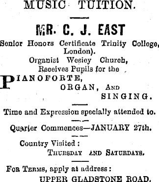 MUSIC TUITION. [ViR. C. J. EAST Senior Honors Certificate Trinity Collego, London). Organist Wesiey Church, Keoeives Pupils for the PIANOFORTE, ORGAN, And SINGING. Time and Expression specially attended to. Quarter Commences—JANUAßY 27th. Country Visited: Thursday and Saturdays, For Terms, apply at address : UPPER GLADSTONE ROAD.