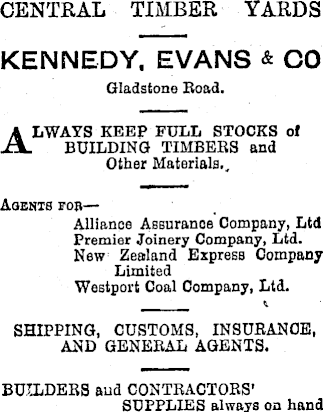 CENTRAL TIMBER YARDS KENNEDY. EVANS & CO Gladstone Boad. Always keep full stocks of BUILDING TIMBEBS and Other Materials., Aoehts for— Alliance Assuranoe Company, Ltd Premier Joinery Company, Ltd. New Zealand Express Company Limited Westport Coal Company, Ltd. SHIPPING, CUSTOMS, INSURANCE, AND GENEBAL AGENTS. BUILDERS and CONTRACTORS' SUPPLIES always on hand,