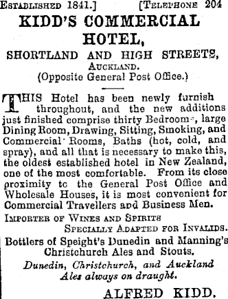 Established 1841.] [Telephone 204 KIDD’S COMMERCIAL HOTEL, SHORTLAND AND HIGH STREETS, Auckland. (Opposite General Post Office.) THIS Hotel has been newly furnish throughout, and the new additions just finished comprise thirty Bedroom--, large Dining Boom, Drawing, Sitting, Smoking, and Commercial’ Rooms, Baths (hot, cold, and spray), and all that is necessary to make this, the oldest established hotel in New Zealand, one of the most comfortable. From its close proximity tc the General Post Office and Wholesale Houses, it is most convenient for Commercial Travellers aDd Business Men. Imfobteb of Wines and Spirits Specially Adapted for Invalids. Battlers of Speight’s Dunedin and Manning’s Christchurch Ales and Stouts. Dunedin , Christchurch , and Auckland Ales always on draught. ALFRED KIDD.