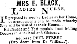 MRS E. BLACK, IS prepare*! to receive Ladies at her Home, or arrangements can be made whereby they will be visited at their Homes.. References and Testimonials from leading Dootors in Auckland and Gisborne. Address: PEEL STREET (Two doors from Dr Williams’).