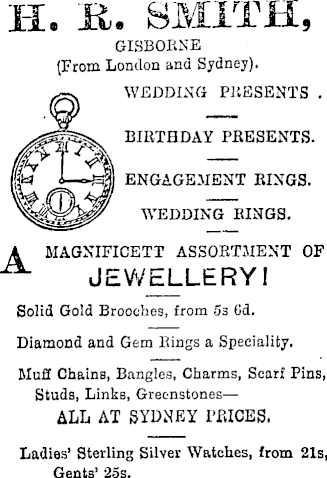 I-I. Jft. SMITH, GISBORNE (From London and Sydney). r> fy WEDDING PRESENTS . BIRTHDAY PRESENTS. ENGAGEMENT RINGS. WEDDING RINGS. A MAGNIFICETT ASSORTMENT OF JEWELLERY I Solid Gold Brooches, from Ss Od. Diamond and Gem Rings a Speciality. Muff Chains, Bangles, Charms, Scarf Pins, Studs, Links, Greenstones— ALL AT SYDNEY PRICES, Ladies’ Sterling Silver Watches, from 21s, Gents’ 255.