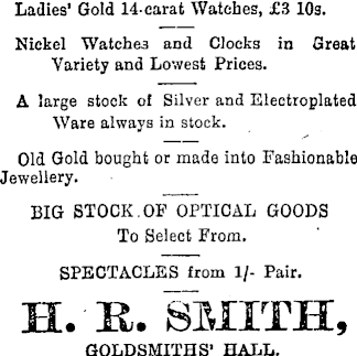 Ladies’ Gold 14-carat Watches, £3 10s. Nickel Watche3 and Clocks in Great Variety and Lowest Prices. A large stock of Silver and Electroplated Ware always in stock. Old Gold bought or made into Fashionable Jewellery. BIG STOCK. OF OPTICAL GOODS To Select From. SPECTACLES from 1/- Pair. H. R. SMITH, GOLDSMITHS’ HALL.