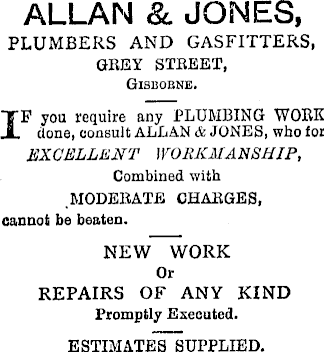 ALLAN & JONES, PLUMBERS AND GASFITTERS, GREY STREET, Gisuobne. IF you require any PLUMBING WORK done, consult ALLAN & JONES, who for EXCELLENT WORKMANSHIP, Combined with MODERATE CHARGES, cannot be beaten. NEW WORK Or REPAIRS OF ANY KIND Promptly Executed. ESTIMATES SUPPLIED.