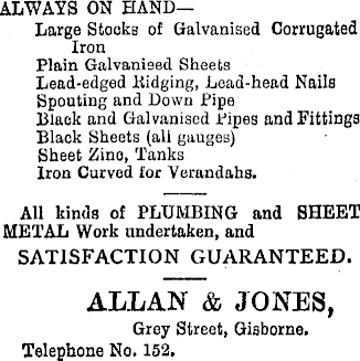 ALWAYS ON HAND— Large Stocks of Galvanised Corrugated Iron Plain Galvanised Sheets Lead-edged Ridging, Lead-head Nails Spouting and Down Pipe Black and Galvanised Pipes and Fittings Black Sheets (all gauges) Sheet Zino, Tanks Iron Curved for Verandahs. All kinds of PLUMBING and SHEET METAL Work undertaken, and SATISFACTION GUARANTEED. ALLAN & JONES, Grey Street, Gisborne. Telephone No. 152.