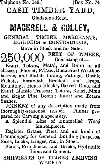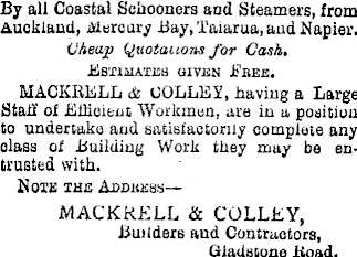By all Coastal Schooners and Steamers, from Auckland, Mercury Bay, Taiarua, and Napier. ( J/ieajp Quotations for Gash. Estimates given Ekee. MACKRELL & COLLES, having a Large Stall of Efficient Workmen, are in a position to undertake and satisfactorily complete any olass of Building Work they may be entrusted with. Note the Addkess— MACKRELL & COLLEY, Builders aud Contractors, Gladstone lioad.