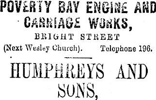 POVERTY BAY ENBiSE AND CAHBIA6E WBMKS, BRIGHT ST BEET (Next Wesley Church). Telephone 196. HUMPHREYS AND