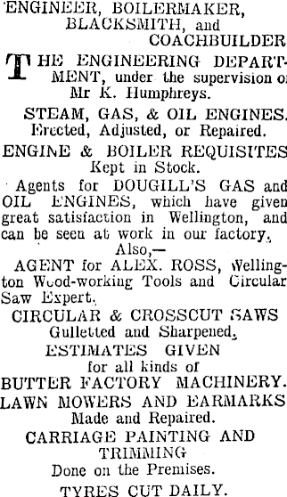 ENGINEER, BOILERMAKER, BLACKSMITH, and COACHBUILDER. THE ENGINEERING DEPARTMENT, under the supervision ol Mr K. Humphreys. STEAM, GAS, & OIL ENGINES. Erected, Adjusted, or Repaired. ENGINE & BOILER REQUISITES Kept in Stock. Agents for DOUGILL’S GAS and OIL ENGINES, which have given great satisfaction in Wellington, and can be seen at work in our factory. Also,— AGENT for ALEX. ROSS, Wellington Wuod-working Tools and Circular Saw Expert. CIRCULAR & CROSSCUT SAWS Gulletted and Sharpened; ESTIMATES GIVEN for all kinds of BUTTER FACTORY MACHINERY. LAWN MOWERS AND EARMARKS Made and Repaired. CARRIAGE PAINTING AND TRIMMING Done on the Premises. TYRES CUT DAILY.