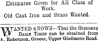 Estimates Given for All Class of Work. Old Cast Iron and Brass Wanted. WANTED KNOWN— That the Gisborne Dailt Tiues can be obtained from A. Bobertson, Grocer, Upper Gladstone Boad.