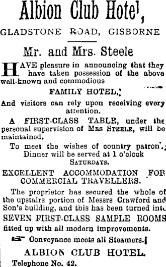 Albion Club Hole', GLADSTONE ROAD, GISBORNE Mr. and Mrs. Steele HAVE pleasure in announcing that they have taken possession of the above well-known and commodious FAMILY HOTEL,.* And visitors can rely upon receiving every attention. A FIBST-CLASS TABLE, under the personal supervision of Mas Steele, will be maintained. To meet the wishes of country patron',; Dinner will be served at 1 o’alook Satoiidavs. EXCELLENT ACCOMMODATION FOB COMMERCIAL TRAVELLERS. ' The proprietor has secured the whole of the upstairs portion of Messrs Crawford and Son’s building, and this has been turned intv. SEVEN FIRST-CLASS SAMPLE ROOMS fitted up with all modern improvements. Conveyance meets all Steamers.} ALBION CLUB HOTEL. Telephone No. 42.