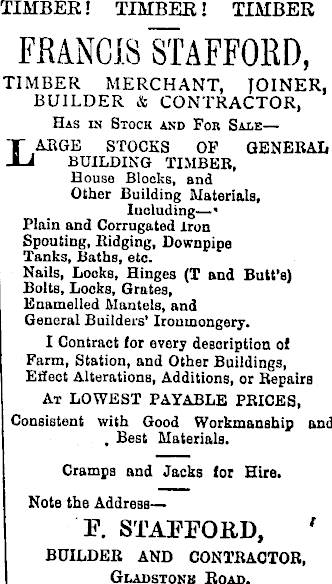 TIMBEE! TIMBEE! TIMBEE FRANCIS STAFFORD, TIMBER MERCHANT, JOINER, BUILDER & CONTRACTOR, Has in Stock and For Sale— Large stocks of general BUILDING TIMBER, House Blocks, and Other Building Materials, Including—■ Plain and Corrugated iron Spouting, Ridging, Downpipo Tanks, Baths, etc. Nails, Looks, Hinges (T and Butt’s) Bolts, Locks, Grates, Enamelled Mantels, and General Builders’ Ironmongery. I Contract for every description of Farm, Station, and Other Buildings, Eflect Alterations, Additions, or Repairs At LOWEST PAYABLE PRICES, Consistent with Good Workmanship and , Best Materials. Cramps and Jacks for Hire. Note the Address— F. STAFFORD, ' j BUILDER AND CONTRACTOR, Gladstone Road.