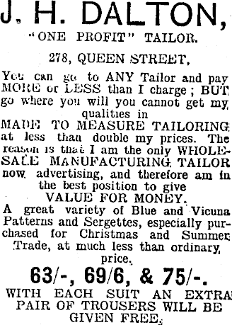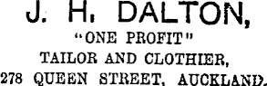 J. H, DALTON, “ONE PROFIT" TAILOR AND CLOTHIER, 278 QUEEN STREET, AUCKLAND.