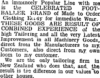 An immencely Popular Line with me is the CELEBRATED FOOTBALLER BRAND of Made to Order Clothing Ktidy for immediate Wear. THESE GOODS ARE RESULT OF COMBINED EXPERIENCE of the high Tailoring and all the very Latest Improvement in all Machinery Goods, direct from the Manufacturers to my, Customers, also direct from my own loom to my customer. We are the only tailoring firm in New Zealand who does that, and the result is tne difference in our values’to other houses.