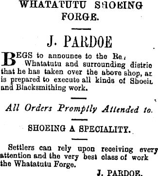 WHATATUTU SHO KING FOEGE. J. PARDOE BEGS to announce to the Re., Whatatutu and surrounding distrio that he has taken over the above shop, ar is prepared to execute all kinds o[ Shoeit and Blacksmithing work. All Orders Promptly Attended to, SHOEING A SPECIALITY. Settlers can rely upon receiving every attention and the very best olass of work the Whatatutu Forge. 3. PARDOE.