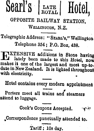 Searl’s |““| Hotel, OPPOSITE BAILWAY STATION, Wellington, N.Z. Telegraphio Address: “ Seabl’b,” Wellington Telephone 354; P.O. Box, 438. EXTENSIVE additions in Stone having lately been made to this Hotel, now makes it one of the largest and most np-to-date in New Zealand. It is lighted throughout with eleotrioity. Hotel oontaina every modern appointment Porters meet all trains and steamers attend to luggage. Cook's Coupons Accepted. -ijm' .Correspondence punctually attended to.