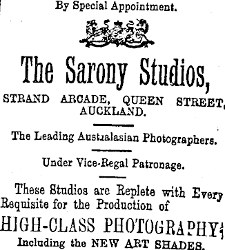 By Special Appointment. The Sarony Studios, STRAND AP.CADE, QUEEN STREET AUCKLAND. ' The Leading Australasian Photographers. Under Vice-Regal Patronage. These Studios are Eeplete with Every Bequisite for the Production of HiGH-OLASS PHOTOGRAPHY^ Including the NEW AJRT SHADES. 1