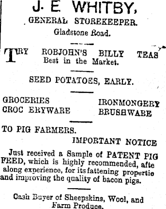 J- E WHITBY, .GENERAL STOREKEEPER. Gladstone Road. rjTRY ROBJOHN’B BILLY TEAS -L Be3t in the Market. SEED POTATOES, EARLY. GROCERIES IRONMONGERY CROC ERYWARE BRDBHWABE TO PIG FARMERS. IMPORTANT NOTICE Just received a Sample of PATENT PIG FEED, which is highly recommended, afte along experience, for its fattening propertie and improving the quality of bacon pigs Cash Buyer of Sheepskins, Wool, and Farm Produce.