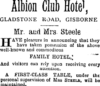 Albion Club Hote>, GLADSTONE HOAD, GISBORNE Mr. and Mrs. Steele HAVE pleasure in announcing that they have taken possession of the above well-known and commodious FAMILY HOTEL,] And visitors can rely upon receiving every attention. A FIRST-CLASS TABLE, under the personal supervision of Mas Stkkub, will be maintained.
