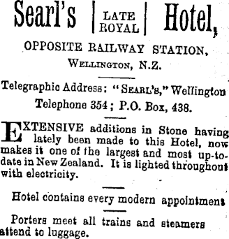 Searl’s Hotel, OPPOSITE RAILWAY STATION, Wellington, N.Z. Telegraphio Address: “Se Aim's,” Wellington Telephone 354; P.O. Box, 438. EXTENSIVE additions in Stone having lately been made to this Hotel, now makes it one of the largest and most up-to-date in New Zealand. It is lighted throuchoat with electricity. Hotel contains every modern appointment Porters meet all trains and steamers attend to luggage.