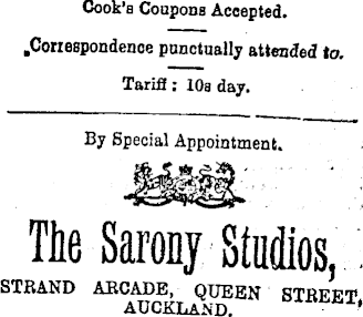 Cook’s Coupons Accepted. .Correspondence punctually attended to. Tariff; 10a day. By Special Appointment. The Sarony Studios, STRAND ARCADE, QUEEN STREET AUCKLAND. ’