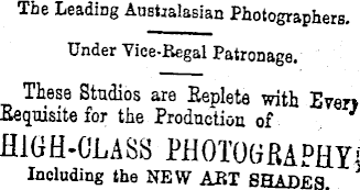 The LeadiDg Australasian Photographers. Under Vice-Regal Patronage. These Studios are Eeplete with Even Requisite for the Production of 7 HIGH-CLASS PHOTOGRAPHY; Including the NEW ART SHADES. '