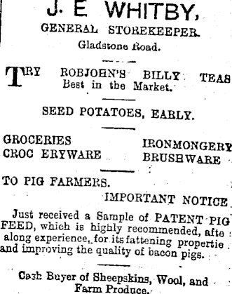 J- E WHITBY, GENERAL STOREKEEPER. Gladstone Road. ITRY ROBJOHN'S BILLY Best in tbe Market. SEED POTATOES, EABLY. TEAS GROCERIES CROC ERTWARE IRONMONGERY BRUSH WARE TO PIG FARMERS. IMPORTANT NOTICE Just received a Sample of PATENT pm FEED, which is highly recommended f J te along experience,.for its fattening propertie and improvmg the quahty of bacon pigs. Cash Buyer of Sheepskins, Wool, and Farm Produce.