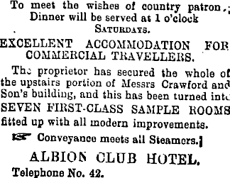 To meet the wishes of country patron,Dinner will be served at 1 o’clock ' Saturdays. EXCELLENT ACCOMMODATION FOP COMMERCIAL TRAVELLERS. The proprietor has secured the whole of the upstairs portion of Messrs Crawford and Son's building, and this has been turned inti. SEVEN FIRST-CLASS SAMPLE ROOMS fitted up with all modern improvements. Conveyance meets all Steamers.] ALBION CLUB HOTEL. Telephone No. 42.