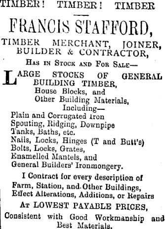 TIMBER! TIMBER! TIMBER FRANCIS STAFFORD, TIMBER MERCHANT, JOINER, BUILDER & CONTRACTOR, Has in Stock and Fob Sale— Large stocks of BUILDING TIMBER, House Blocks, and GENERAL Other Building Materials, Including— Plain and Corrugated Iron Spouting, Ilidging, Dotvnpipe Tanks, Baths, etc. Nails, Locks, Hinges (T and Butt's) Bolts, Looks, Grates, Enamelled Mantels, and General Builders’ Ironmongery. I Contract lor every description of Farm, Station, and. Other Buildings, Effect Alterations, Additions, or Repairs At LOWEST PAYABLE PRICES, Consistent with Good Workmanship and Best Materials.
