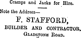 Cramps and Jaoks for Hire. Note the Address— F. STAFFORD, BUILDER AND CONTRACTOR, Gladstone Road.