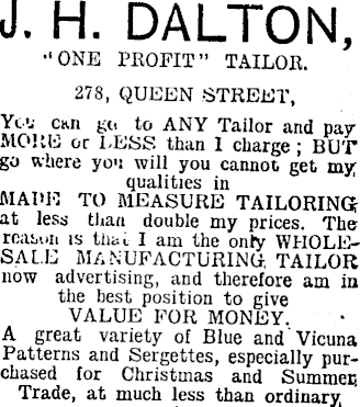 J. H. DALTON, -ONE PROFIT” TAILOR. 278, QUEEN STREET, You ck.ii go to ANY Tailor and pay MORE or LESS than I charge ; BUT go where you will you cannot get my; qualities in MARE TO MEASURE TAILORING at less than double my prices. The reason is that I am the only WHOLESALE MANUFACTURING, TAILOR now advertising, and therefore am in the best position to give VALUE FOR MONEY. A great variety of Blue and Vicuna Patterns and Sergettes, especially purchased for Christmas and Summer, Trade, at much less than ordinary