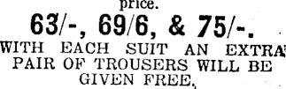price. 63/-, 69/6, & 75/-. WITH EACH SUIT AN EXTRA PAIR OP TROUSERS WILL BE GIVEN FREE.