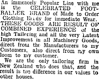An immencely Popular Line with me is the CELEBRATED FOOTBALLER BRAND of Made to Order Clothing Reedy for immediate Wear. THESE GOODS ARE RESULT OF COMBINED EXPERIENCE of the high Tailoring and all the very Latest Improvement in all Machinery Goods, direct from the Manufacturers lo my Customers, also direct from my own loom to my customer. We are the only tailoring firm in New Zealand who does that, add the result is the difference in our values to other houses.